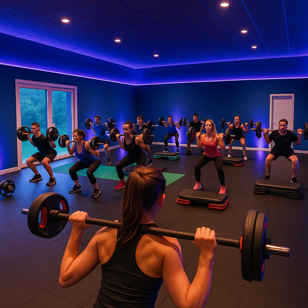 L’espace fitness est un studio polyvalent dédié aux cours collectifs, conçu pour offrir un cadre de pratique clair et sécurisant. Le matériel mis à disposition (tapis, steps, barres légères, élastiques, petits accessoires) permet l’organisation de formats variés — Bodypump, Bodybalance, CAF, Step, Yoga, Pilates, Stretching — avec des options d’intensité adaptées.